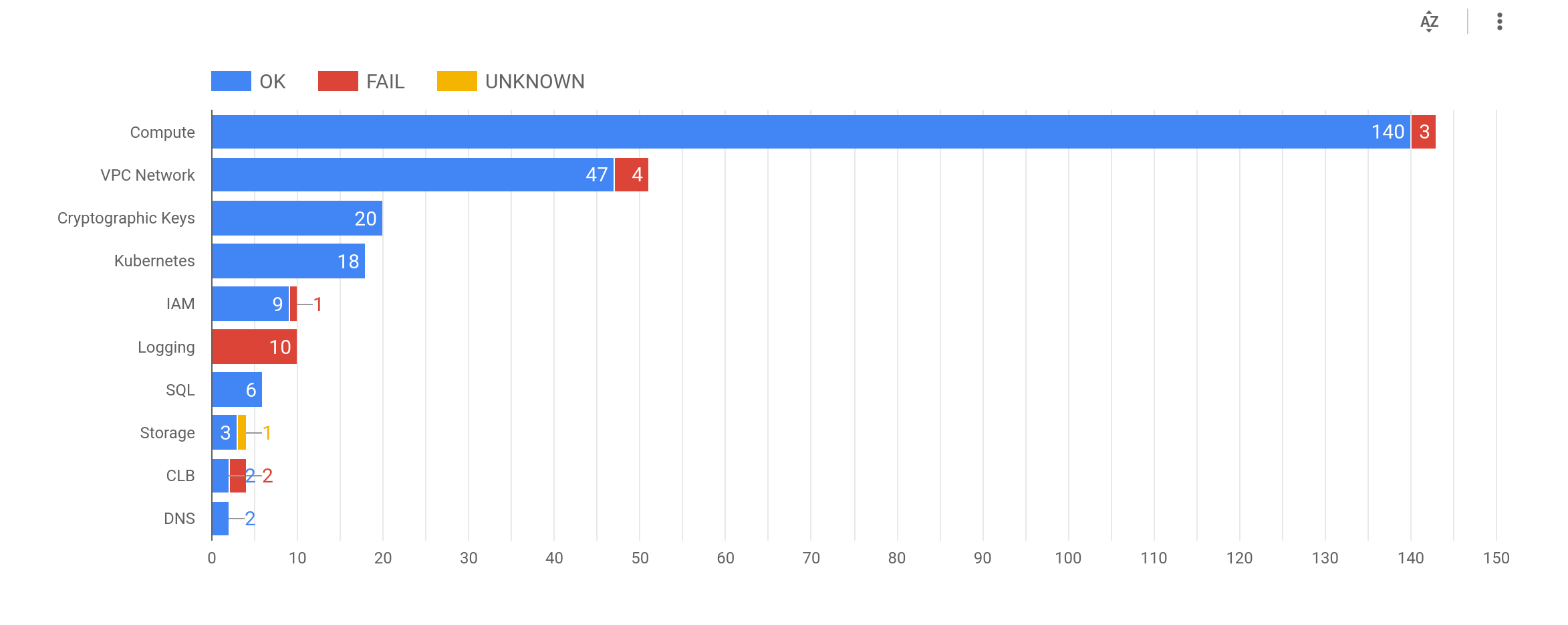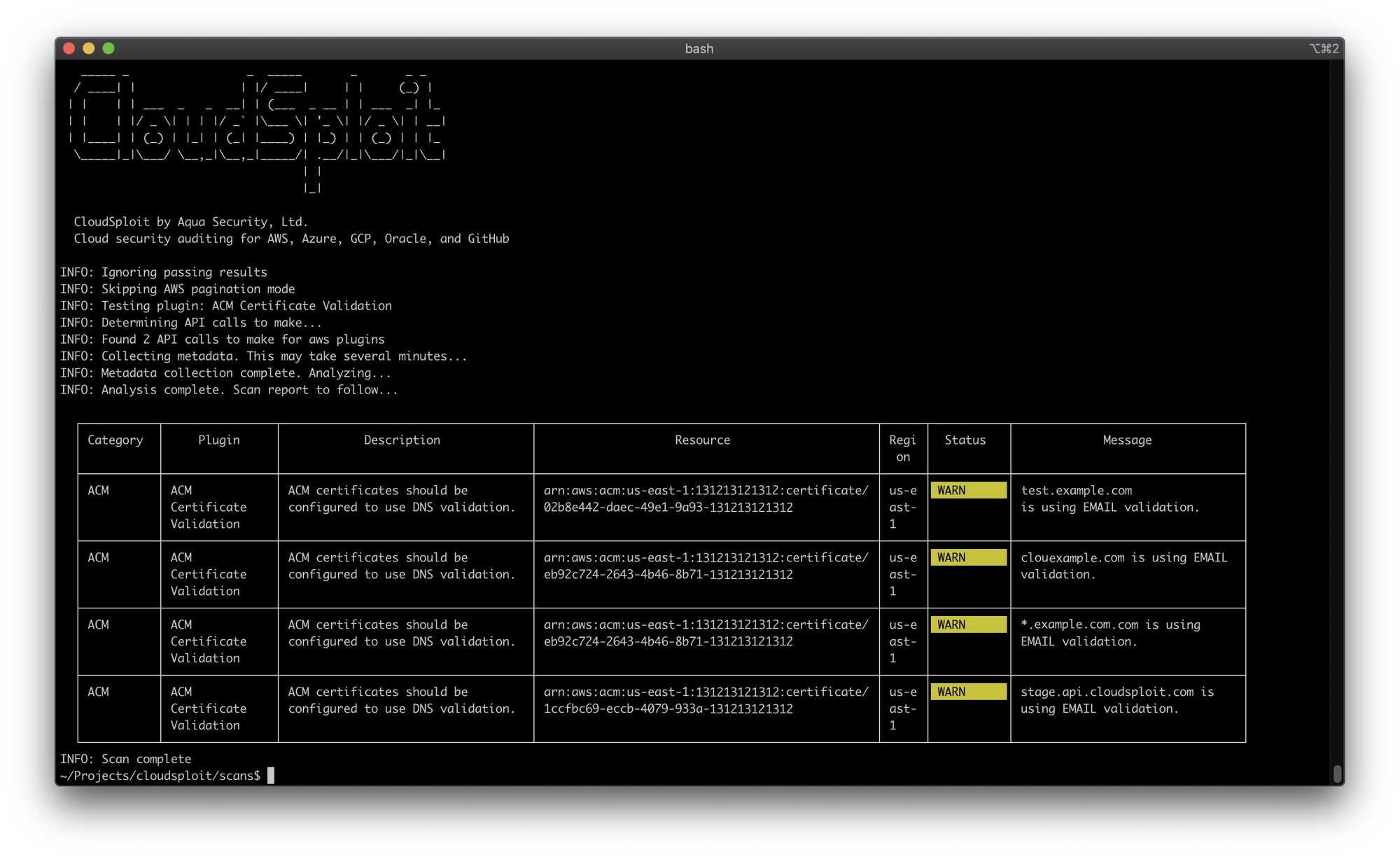 ./index.js --compliance=cis --compliance=pciThe scan is usually quick, but may sometimes take up to a minute to complete. You can find more flags, including the configuration options for other cloud platforms, at the Github page.