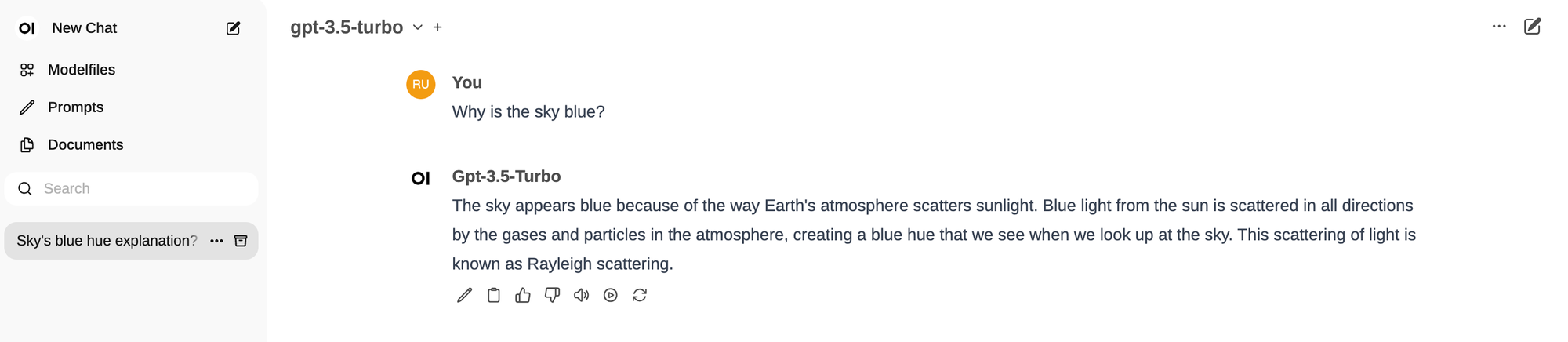 As mentioned earlier, Open WebUI has an extensive set of features, well beyond the standard ChatGPT capabilities. Features like models, prompts and documents are beyond the scope of this post, but feel free to explore them on your own.